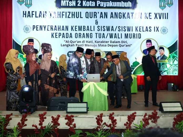 Payakumbuh – MTsN 2 Kota Payakumbuh menggelar Haflah Tahfizhul Quran Angkatan ke-XVIII sekaligus penyerahan kembali siswa/siswi kelas IX kepada orang tua/wali murid di Aula Politeknik Pertanian Negeri Payakumbuh, Kamis 30/04/2026.