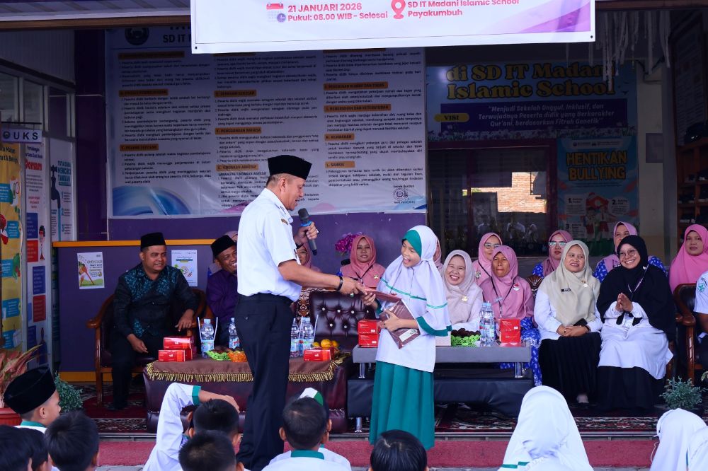 Peringatan HGN ke-66 di SDIT Madani Islamic School diisi dengan berbagai kegiatan edukatif, antara lain penyuluhan gizi, pemeriksaan kesehatan sederhana, serta pembagian makanan sehat sebagai contoh menu gizi seimbang bagi siswa. (MC)