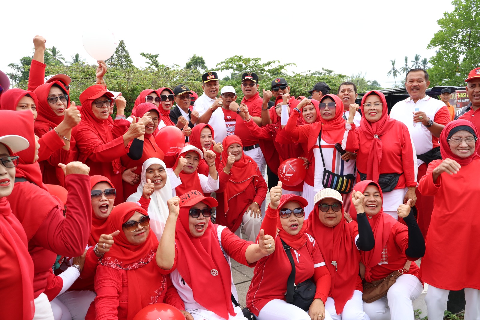 Terlihat suasana jalan sehat berlangsung dengan ceria dan penuh keakraban yang mendominasi acara, dan peserta jalan sehat mengenakan atribut merah-putih.
