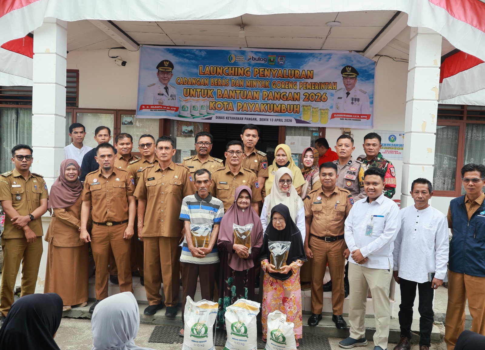 PAYAKUMBUH – Wali Kota Payakumbuh, Zulmaeta melalui Asisten bidang Perekonomian dan Pembangunan, Yasrizal menyerahkan bantuan Cadangan Beras Pemerintah (CPP) dan minyak goreng kepada 466 Kepala Keluarga penerima bantuan pangan di halaman Kantor Lurah Tigo Koto Diate, Kecamatan Payakumbuh Utara, Senin (13/4/2026).